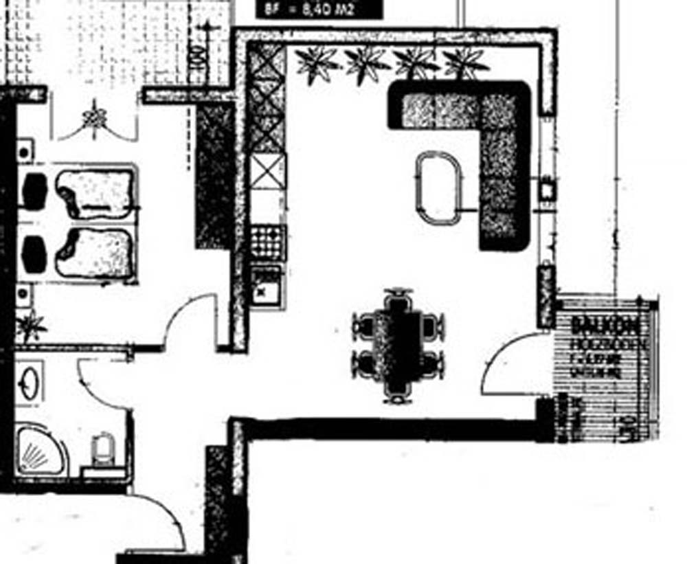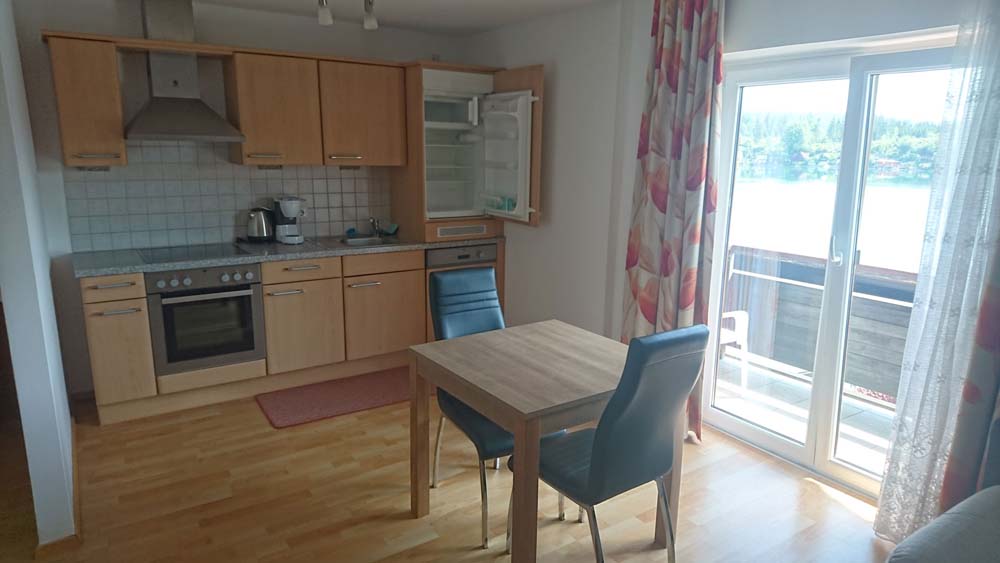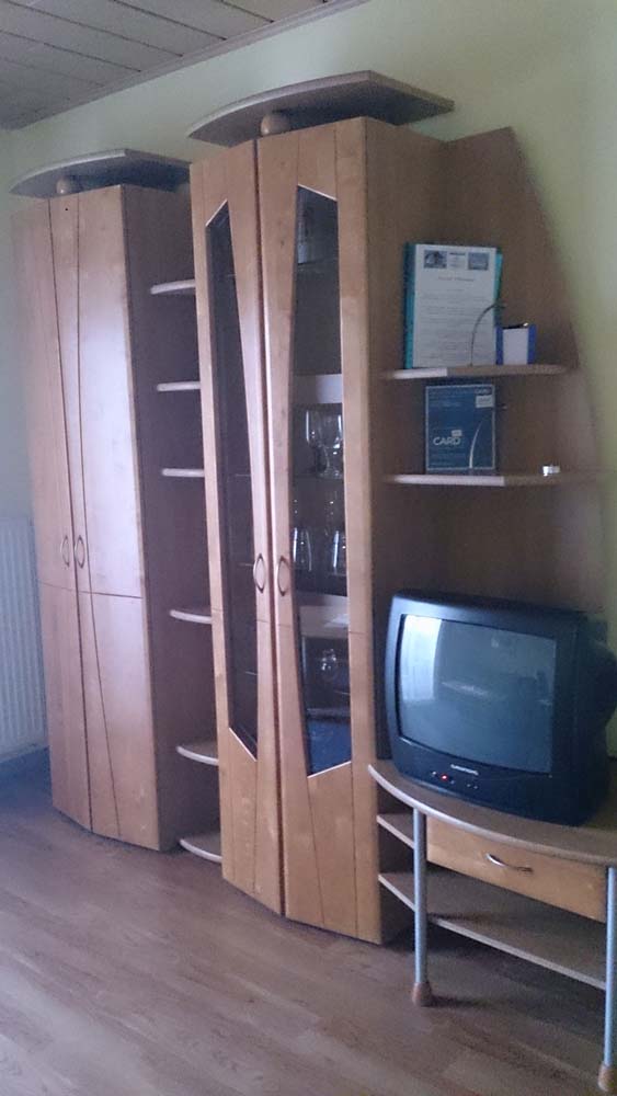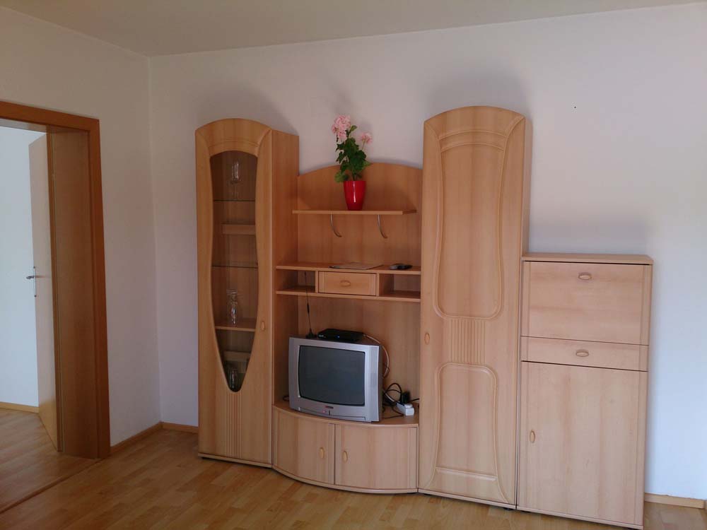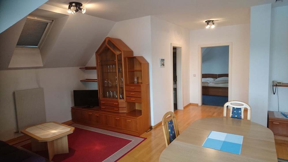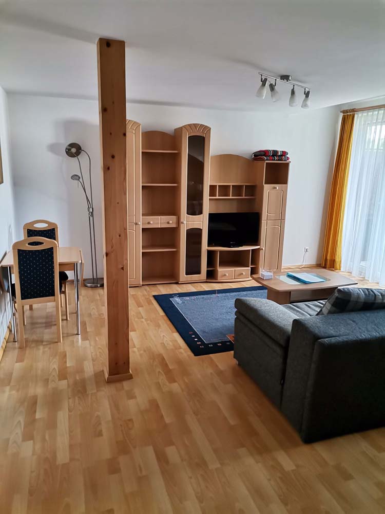 Wohnzimmer mit Küchenzeile voll ausgestattet (keine Mikrowelle) und Essecke