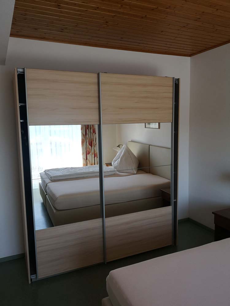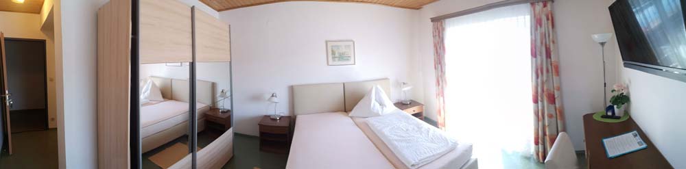 Zimmer 10 mit Platz für 2 Personen mit Doppelbett, Schreibtisch, Flachbildfernseher mit SAT-TV, Badezimmer mit Dusche/WC sowie Fön bietet auch einen Balkon zur Seeseite.