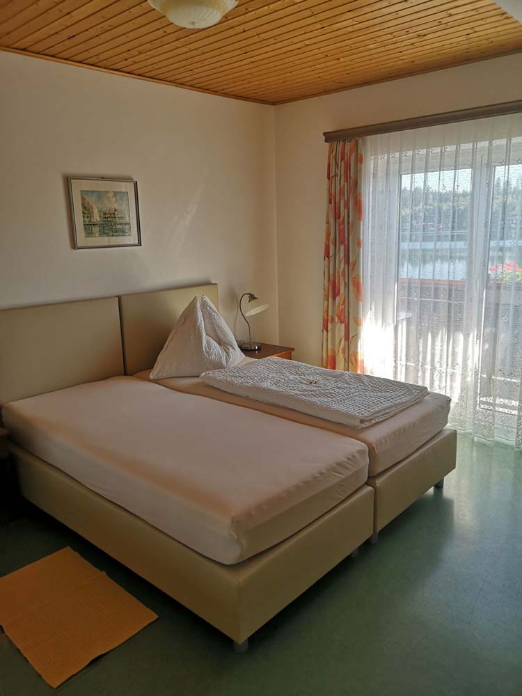 Zimmer 9 bietet Platz für max. 4 Personen mit Doppelbett, ausziehbarer Couch, Schreibtisch, Flachbildfernseher mit SAT-TV, Dusche und WC, sowie Fön. Ein großes Panoramafenster öffnet den Blick zum See und ein Balkon lädt zum Relaxen mit Sicht auf den Garten ein.
